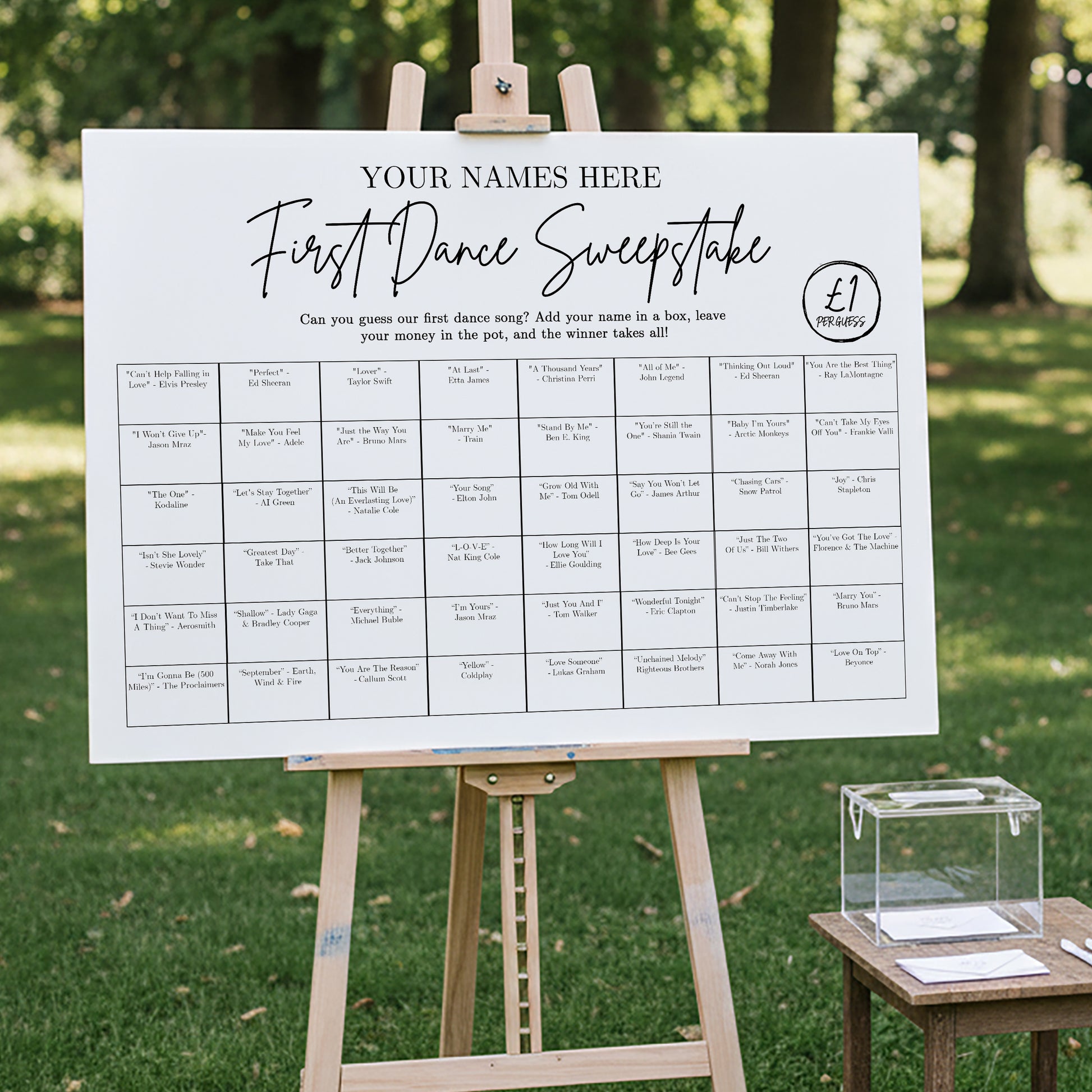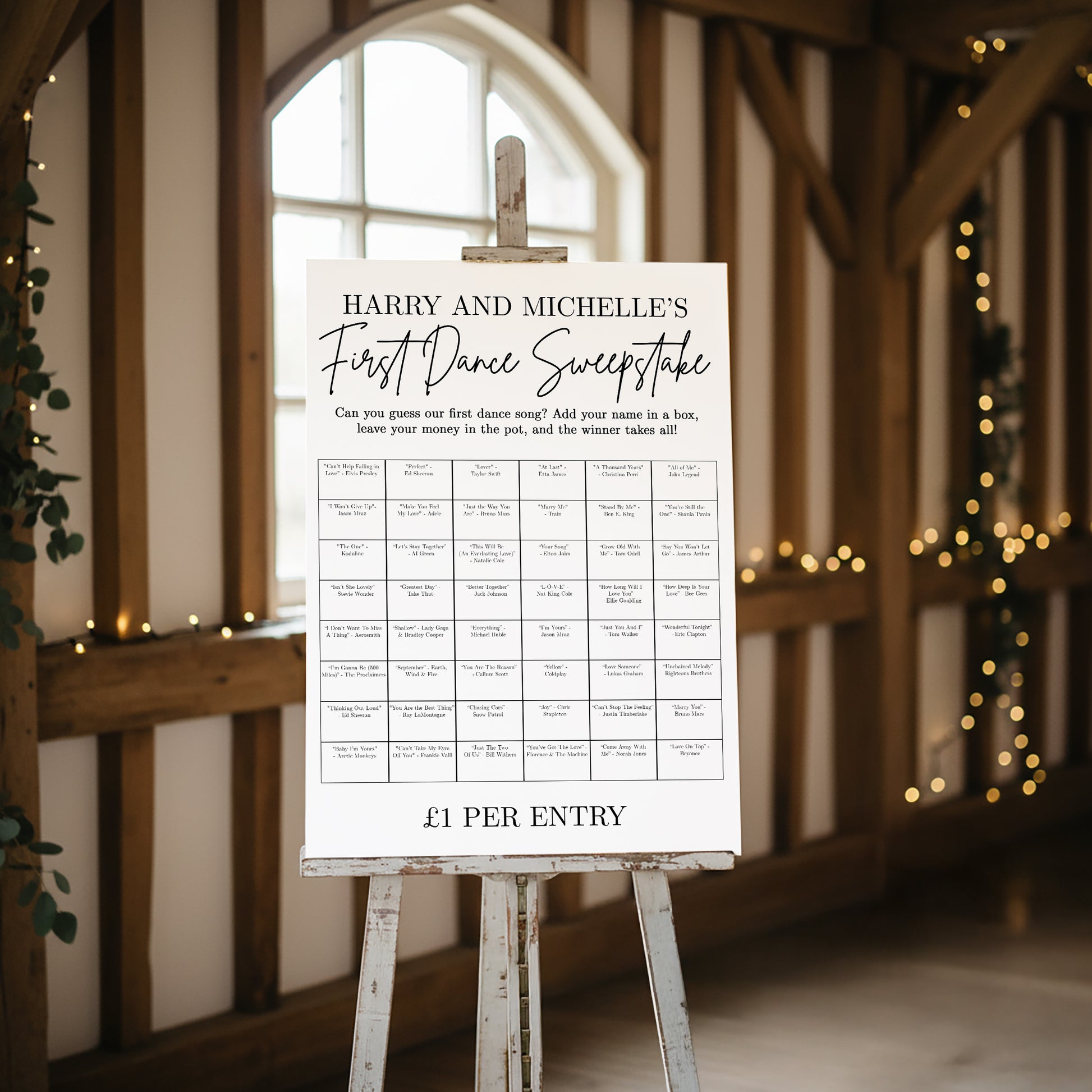 Get your guests talking (and guessing!) with our First Dance Sweepstake Sign - a fun, interactive feature that adds laughter and friendly competition to your wedding day.